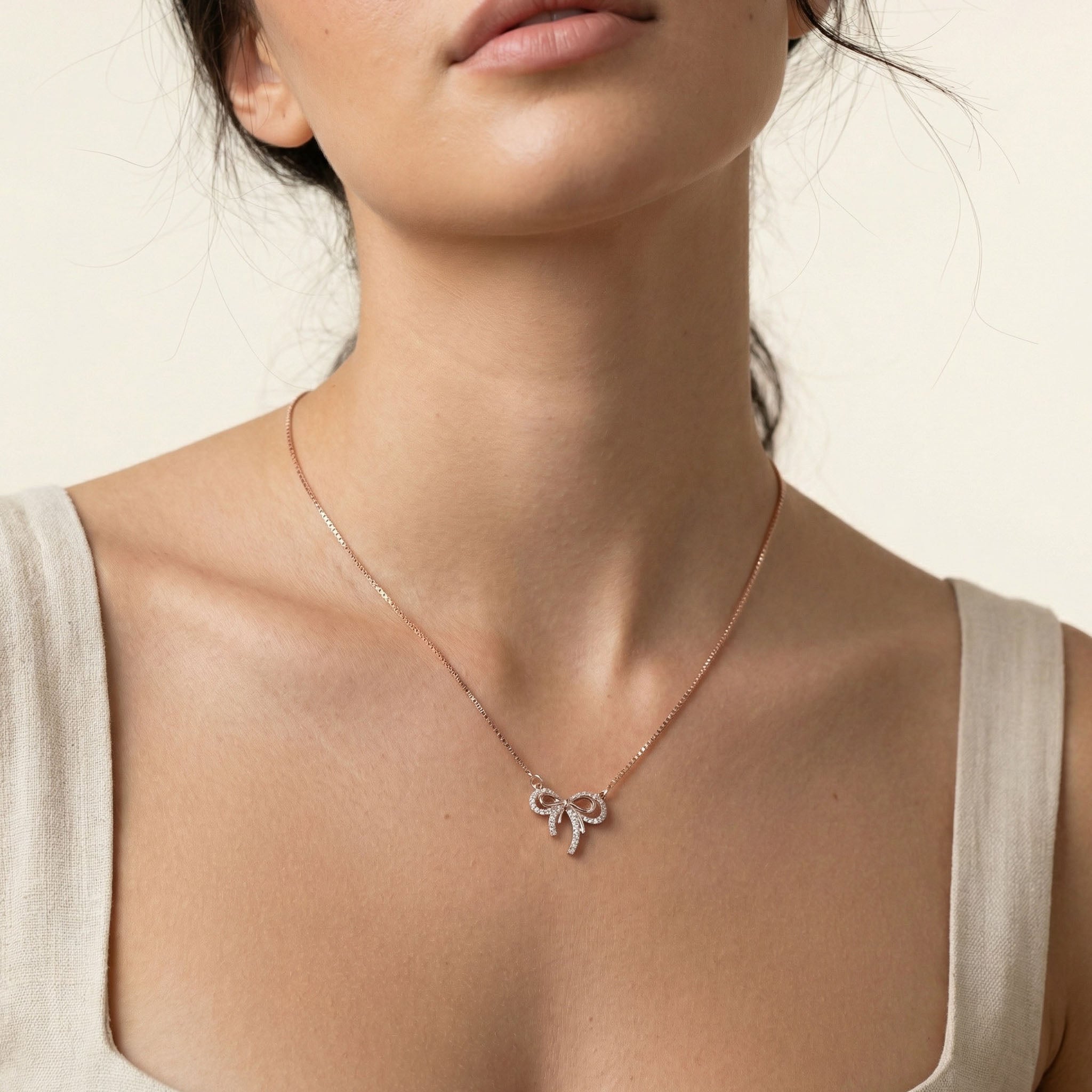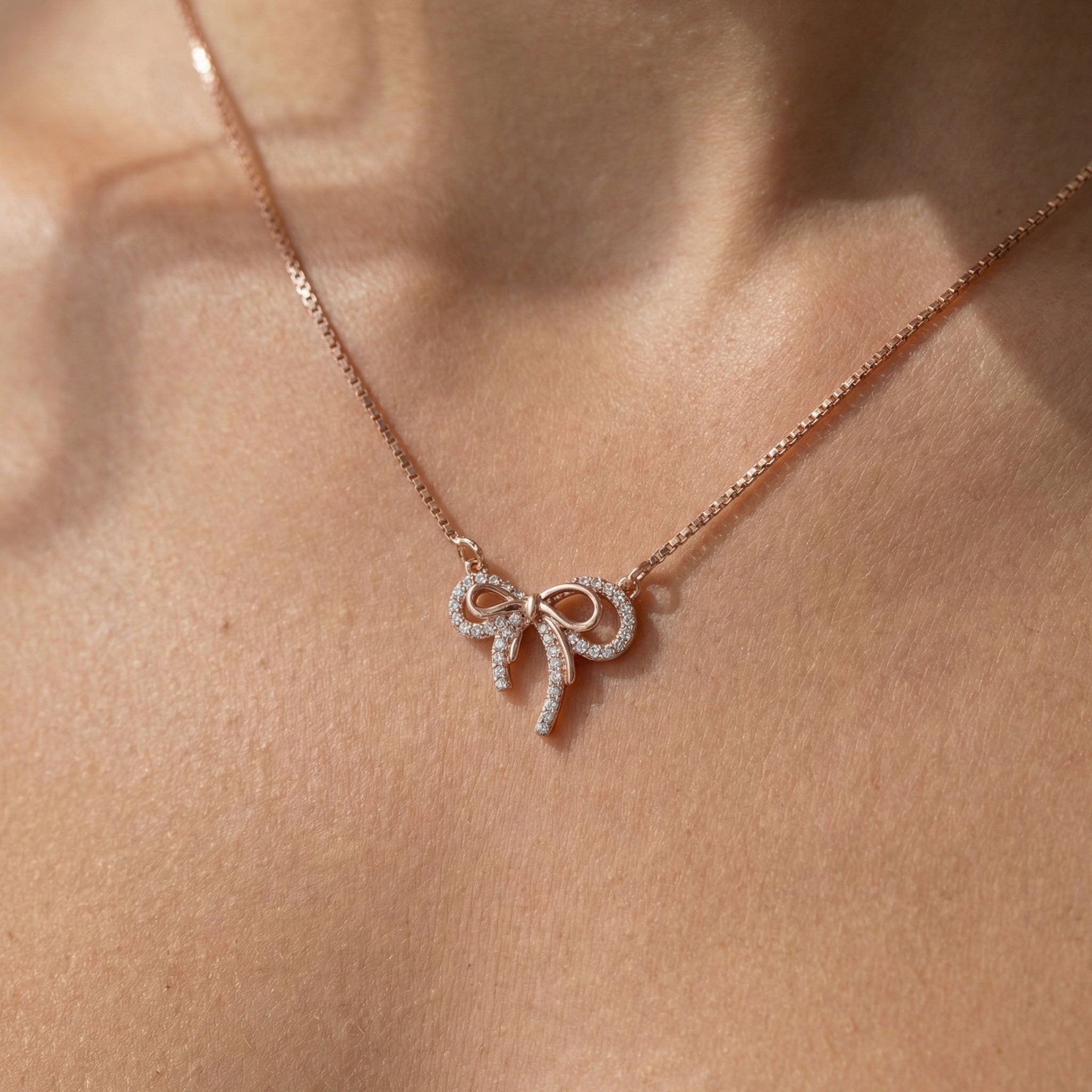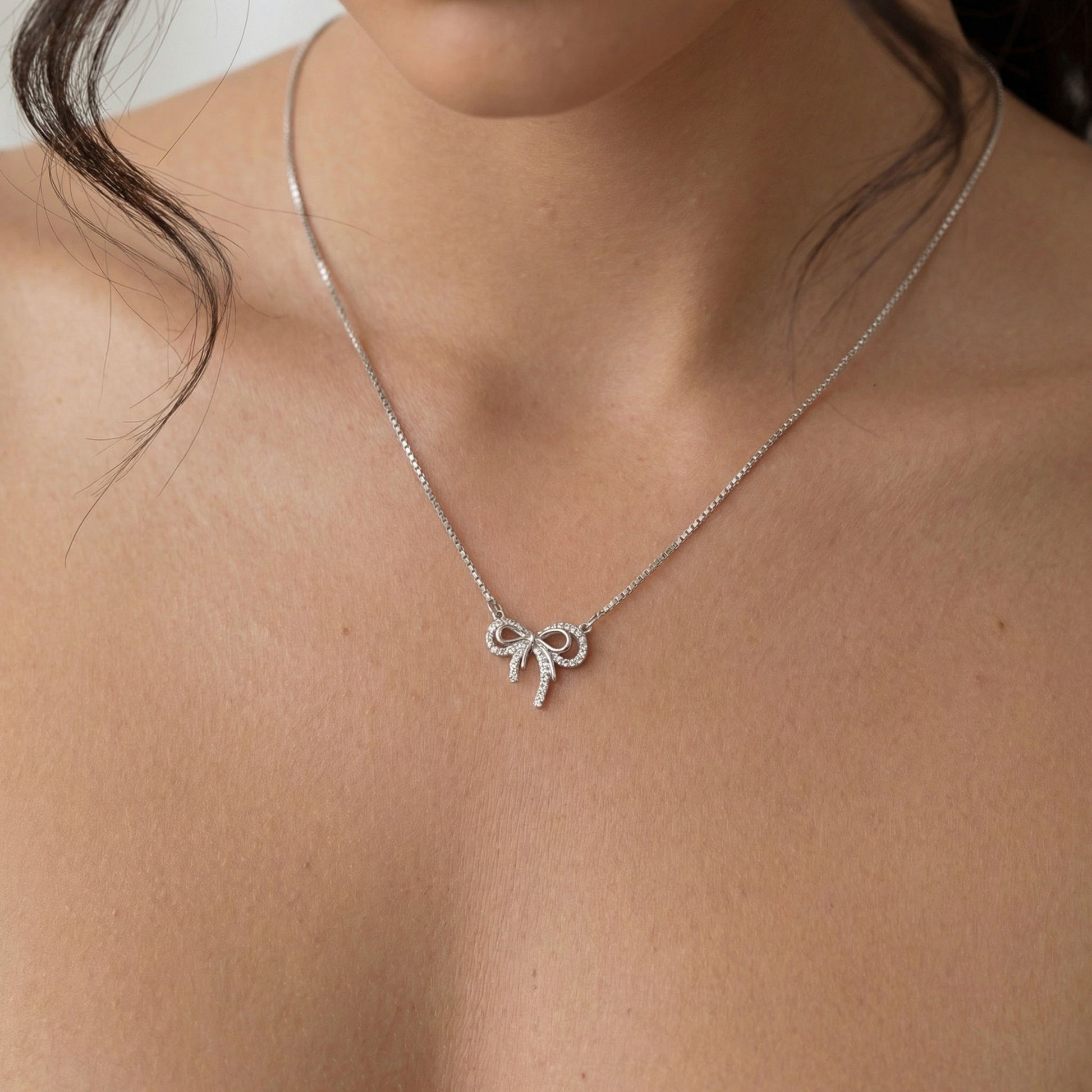 This dainty pendant features a charming double bow design. Beautiful zircons adorn one bow, while the other offers a minimalist feel. Perfect for layering or as a stand alone piece.