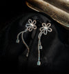The earrings capture the essence of a blooming flower in display. Five petals set with zircon stones exude grace, while a semi-transparent stone at the center adds a touch of mystery. Cascading lines adorned with stones placed in elegant teardrops.