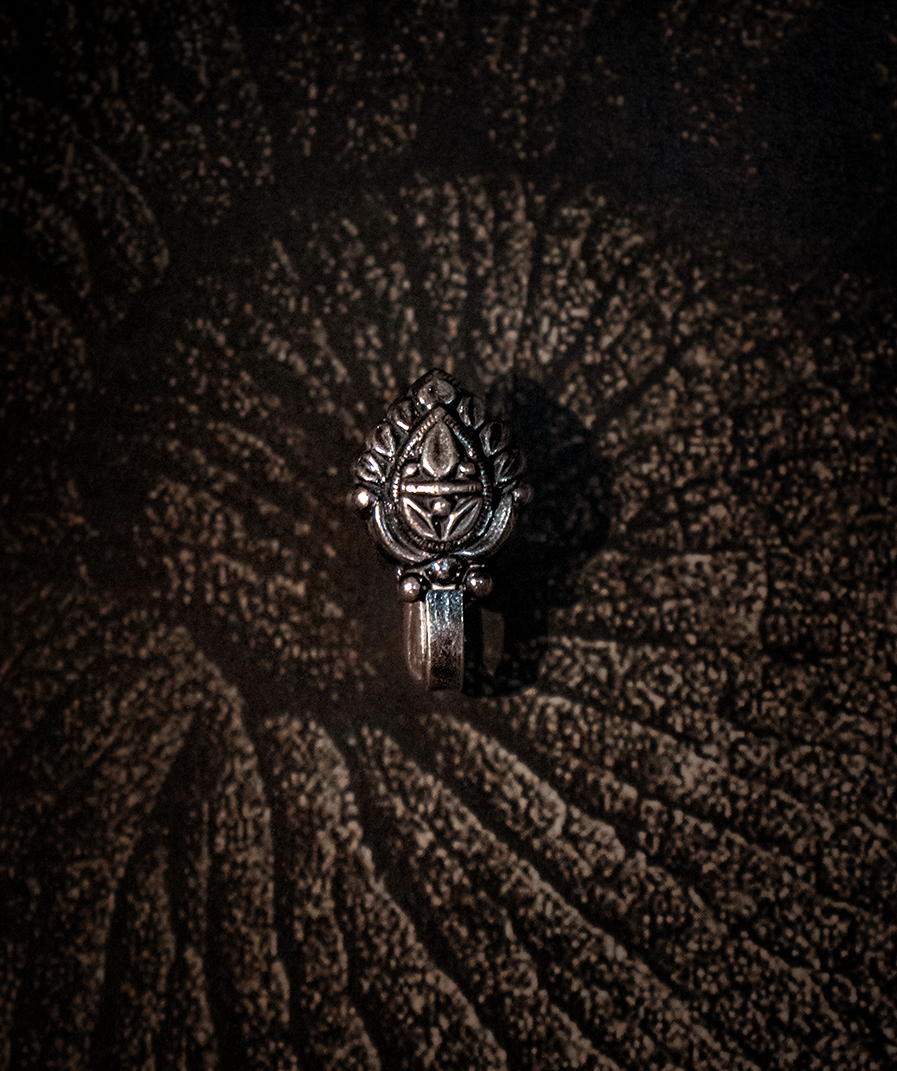 Premium oxidized silver nose pin inspired by ancient Indian temple architecture. Featuring intricate geometric patterns and ornate detailing reminiscent of sacred temple carvings, Mandira showcases traditional craftsmanship in contemporary wearable form.