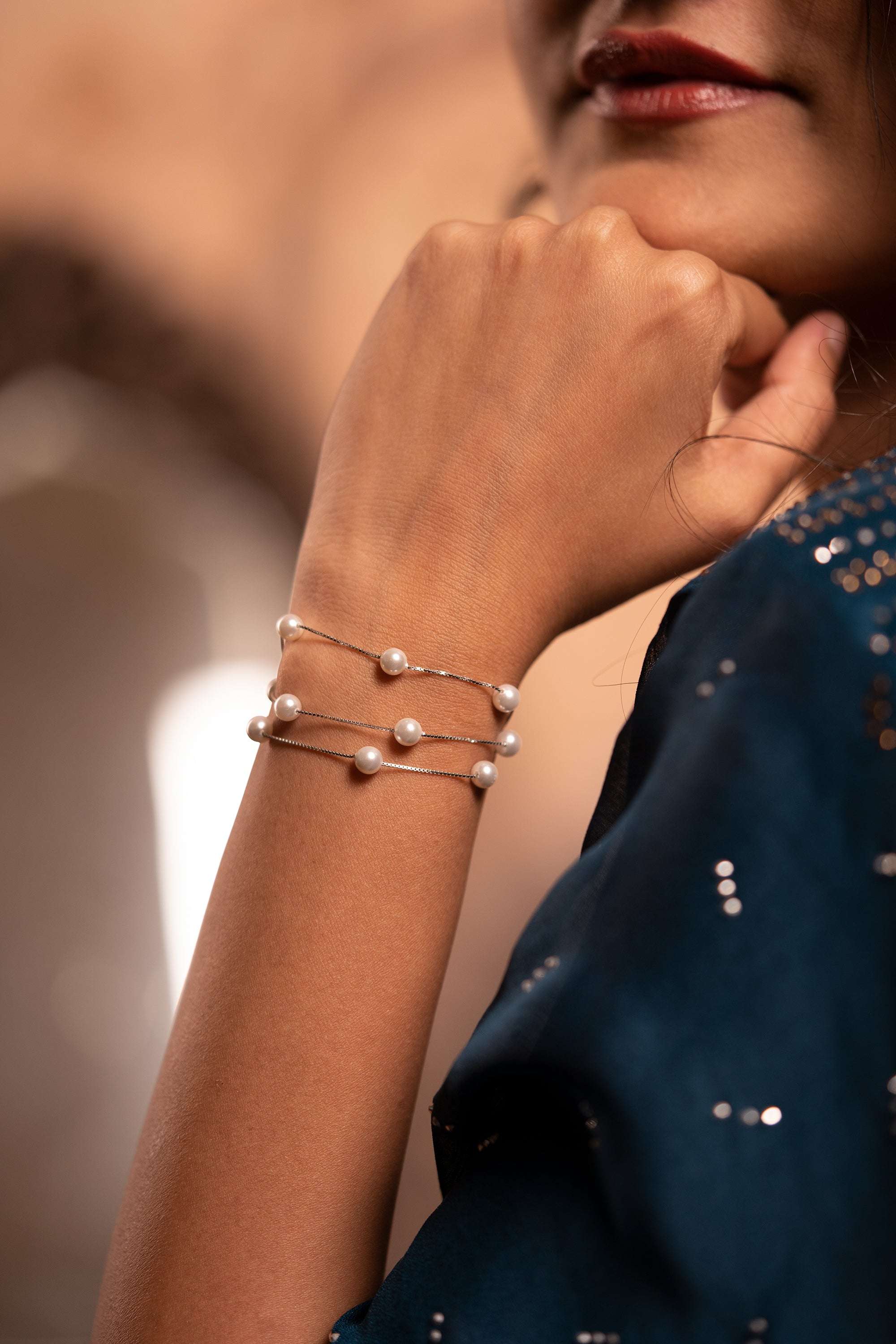 The perfect accessory for effortless chic. This three-strand pearl bracelet is both stylish and comfortable, making it ideal for everyday wear or special festive occasions.