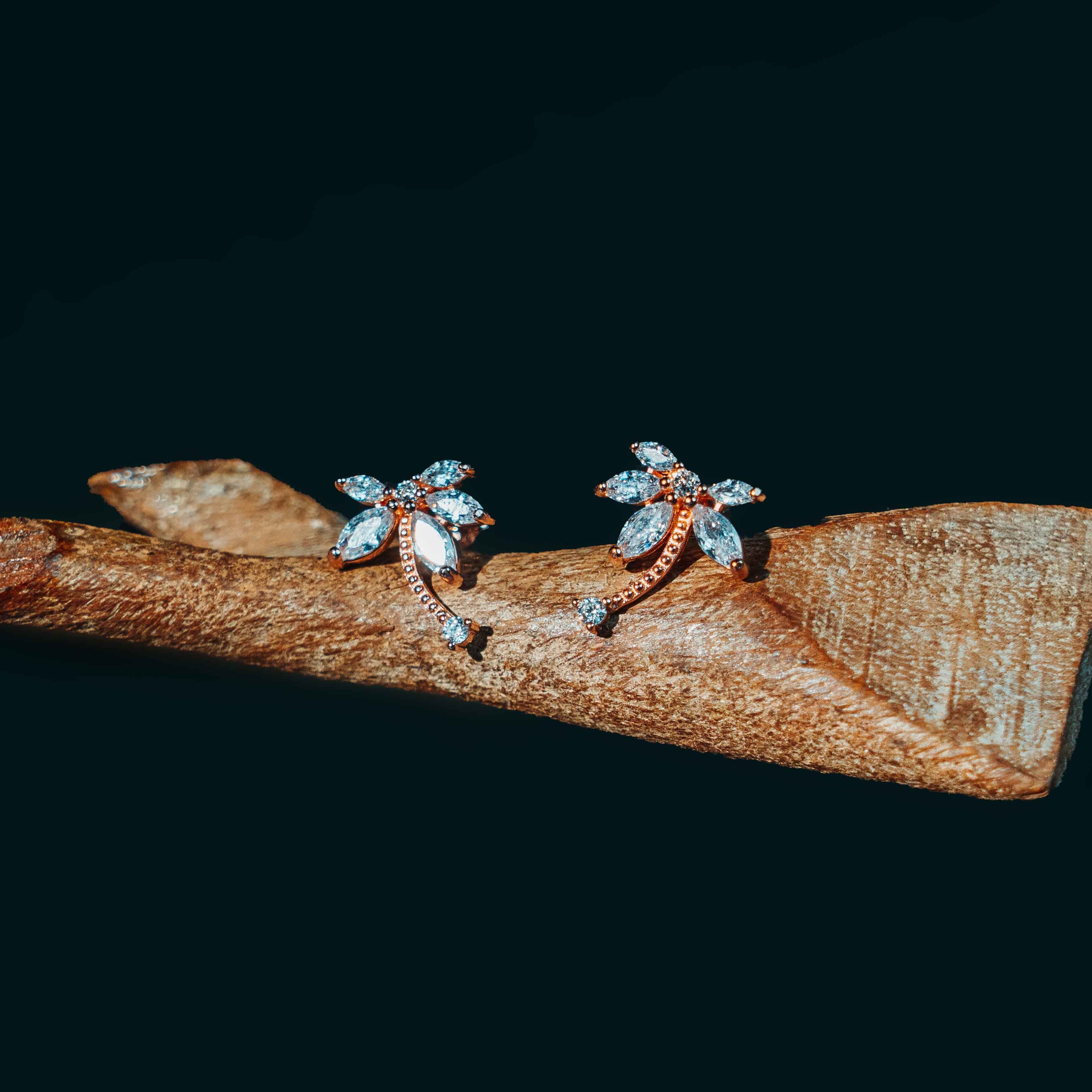 The Coconut Tree Stud Earrings are crafted in certified 925 sterling silver with a warm rose gold finish. Five delicate leaves form the palm while a sleek trunk creates an elegant silhouette. A sparkling zircon stone adds subtle brilliance at the base. Finished with an anti tarnish coating and designed hypoallergenic, these silver earrings offer lasting shine and comfortable wear.