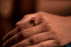 This minimalist ring is the perfect accessory for the modern woman. The sleek design and bold red stone create a striking contrast.