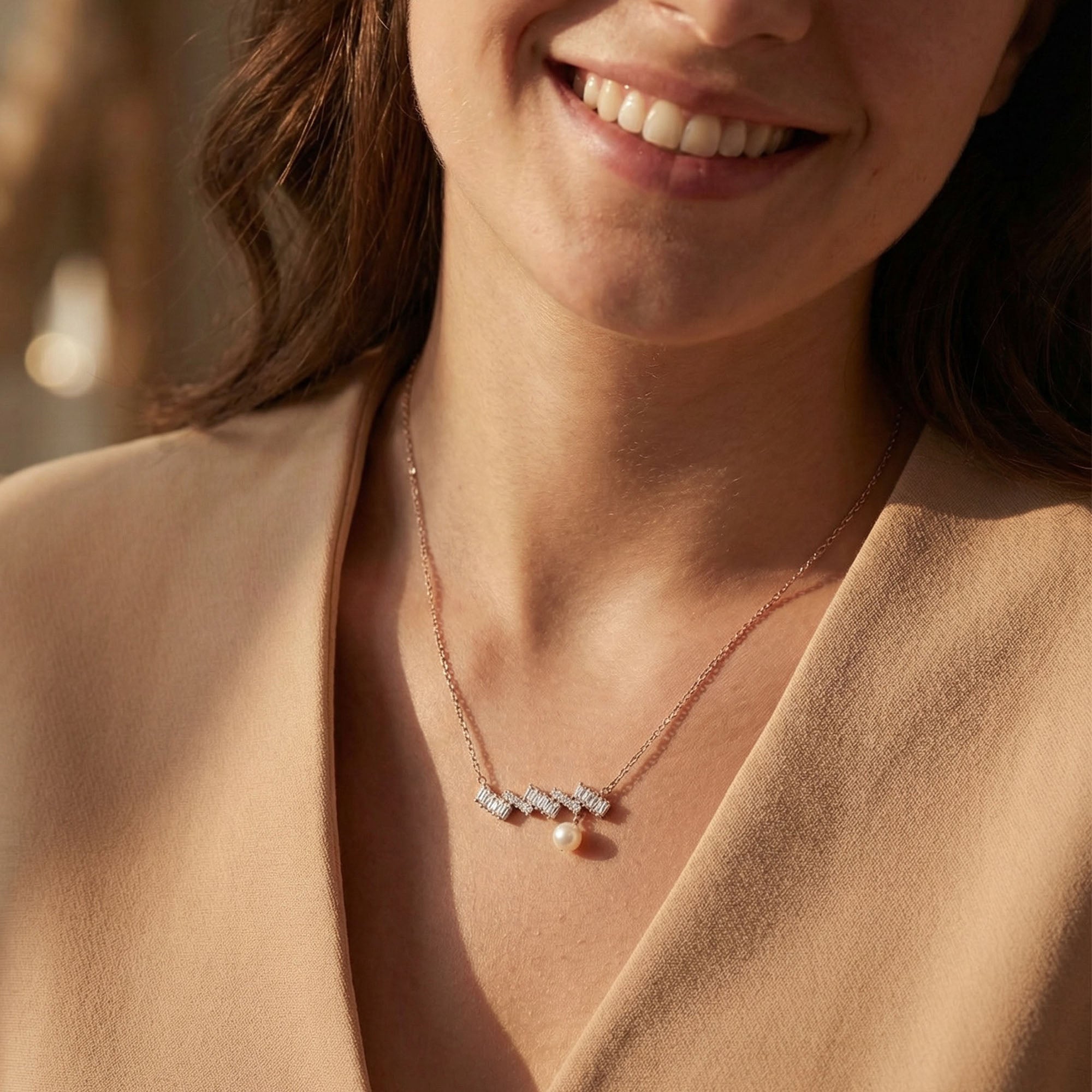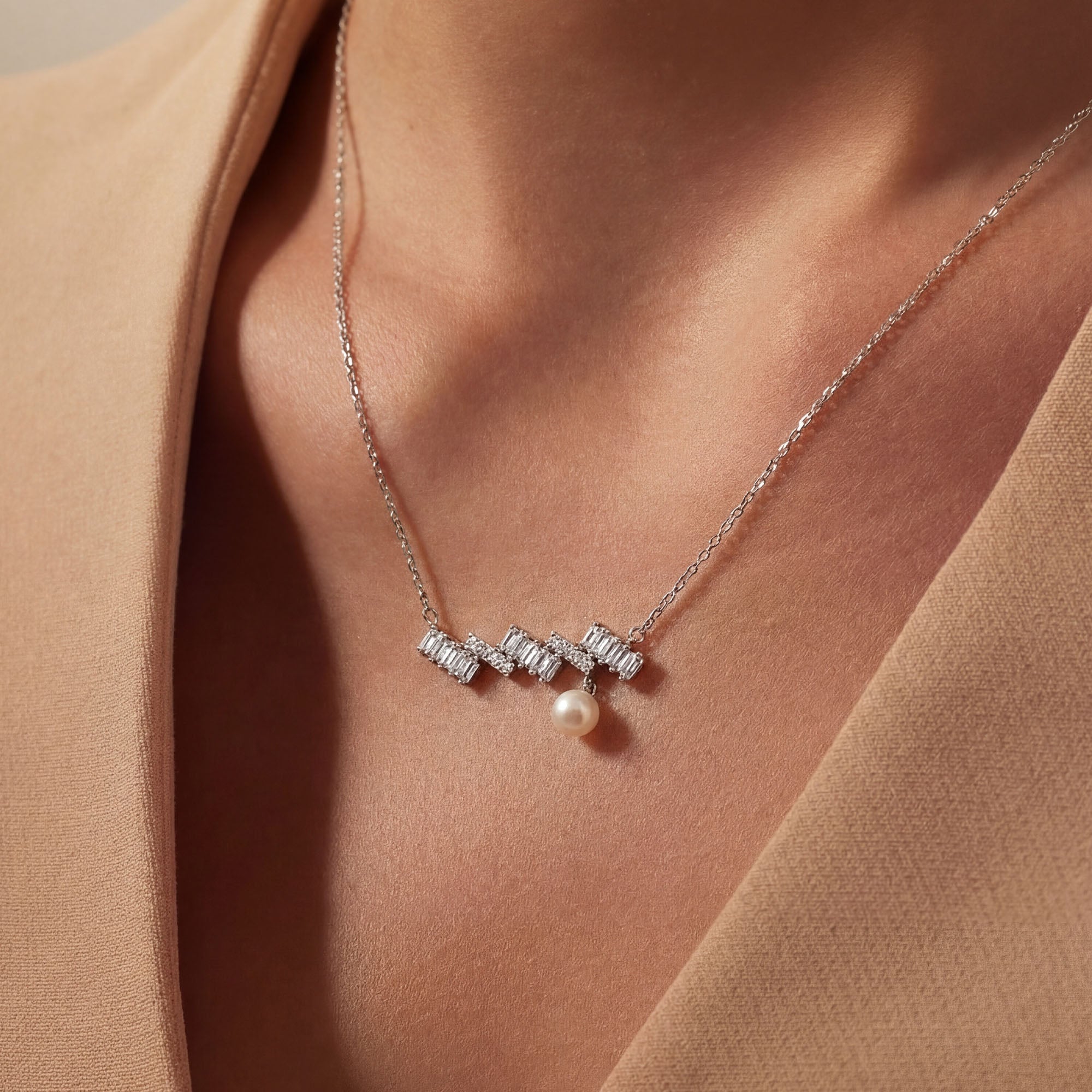 The Ice Pearl Pendant is crafted in pure 925 sterling silver with a sleek horizontal bar design. Shimmering zircon stones add refined brilliance across the bar. A delicate pearl drop adds graceful movement and soft elegance. Finished with an anti tarnish and hypoallergenic coating, this silver pendant creates a sophisticated and modern statement.